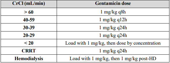 - Gentamicin: 10 mg/kg q24h (max dose 700mg); only for patients with CrCl > 70 mL/min