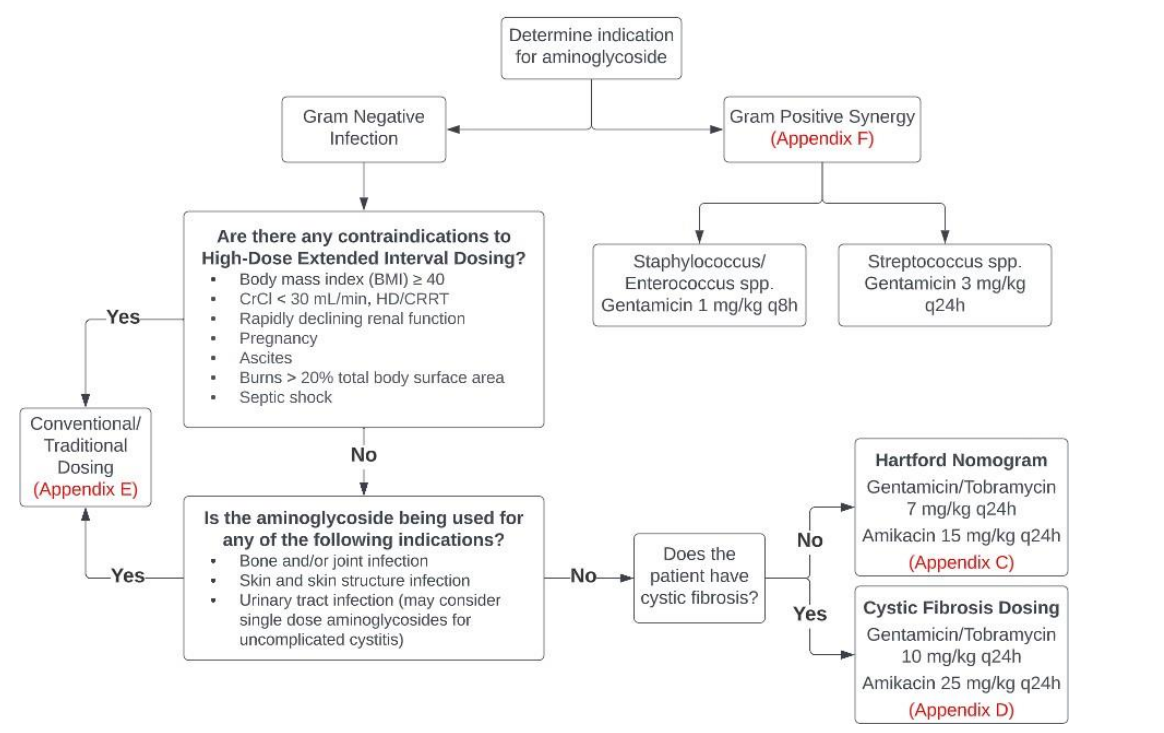 - Select an appropriate aminoglycoside dosing method (refer above or Appendix A in the policy)